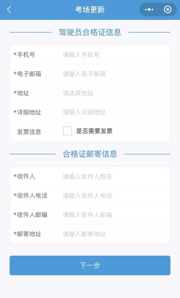 以上步驟完成后,需要填寫駕駛員合格證信息以及合格證郵寄信息,郵寄地址一定要填寫確保自己能收到的地址,需要發(fā)票的用戶選擇發(fā)票選項,填寫發(fā)票信息。確認(rèn)信息無誤后,選擇下一步。